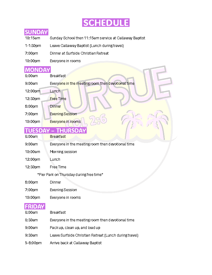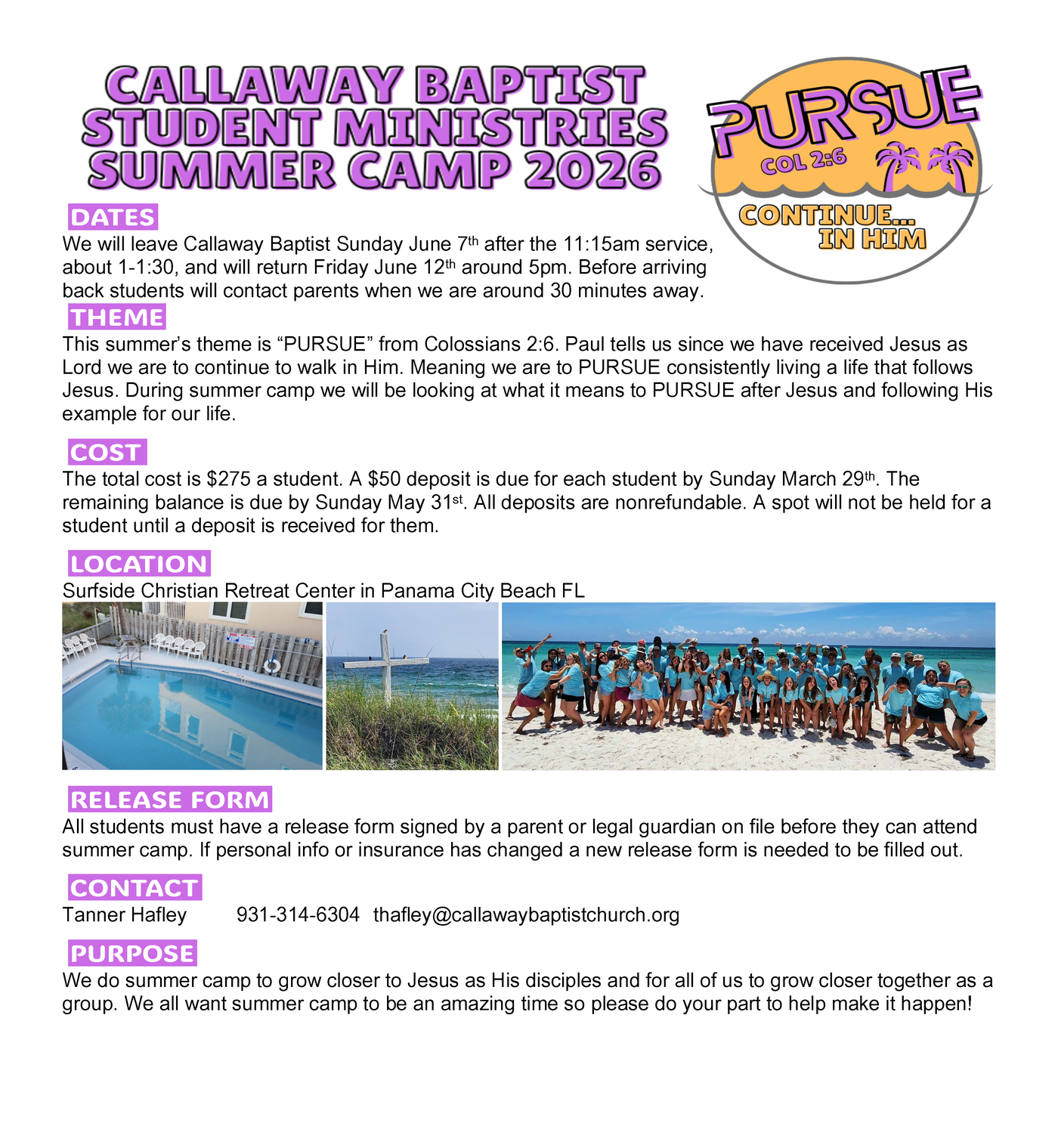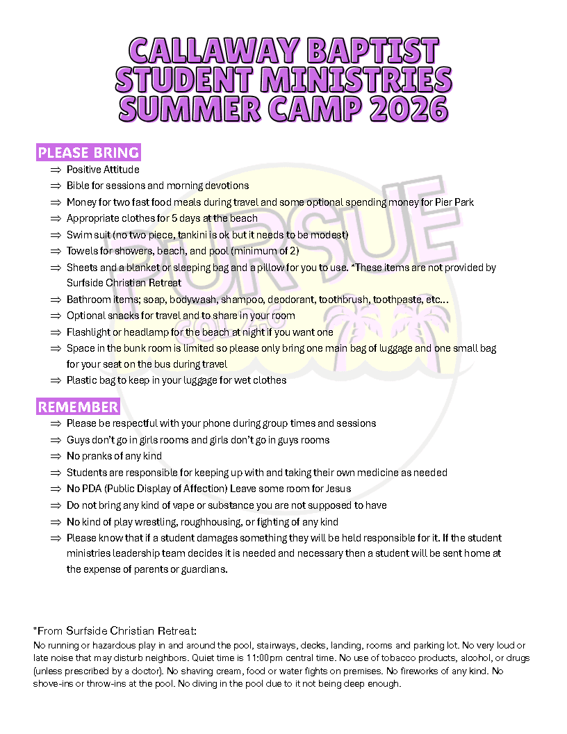 Location: SURFSIDE CHRISTIAN RETREAT | Panama city beach, fl | deposit $50 due march 29th | total cost $275 per student due by may 31st